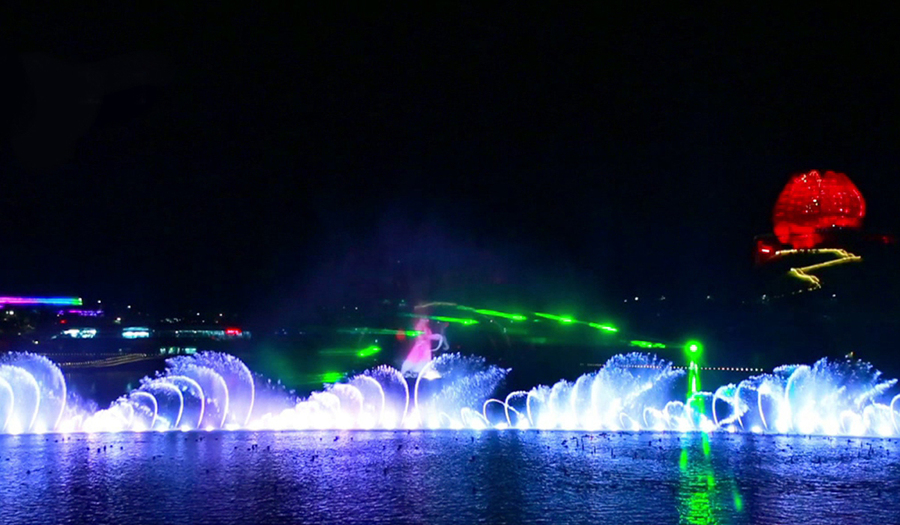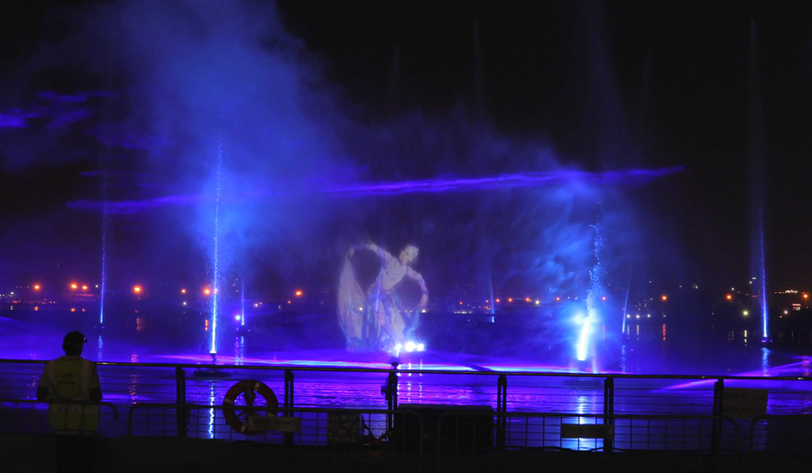 水幕通常高達(dá)20余米,寬30-60米,水幕電影播放時的畫面具有很強(qiáng)的立體感和空間感,人物似騰飛天空或自天而降,與自然夜空融為一體,產(chǎn)生一種虛無縹緲和夢幻的感覺,再配以激光圖案,場面更顯宏大,氣勢磅礴。水幕電影適用于重大節(jié)日集會、大型廣場、主題公園場所。